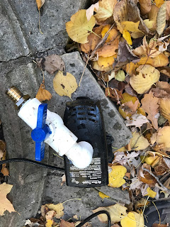 Our mason, Dave, stopped by Thursday to drill the hole in the stone block. It is a 1-inch hole that goes straight down through the block, centered about a third of the way back from the front edge. That evening, Little Man and I moved the block into place (did I say it weighs over 325 pounds?) and ran 1-inch vinyl tubing from the pump and up the full length of the hole. I had to make some adjustments to get the proper flow rate and to get the tubing to route properly without kinking. A 90-degree elbow connected to the pump outlet, a valve to control the flow, and barbed fitting for the tubing were all that was needed. I also needed to cut a little of the lip of the grate away to be able to get the pump cord in and out easily. Because it will get damaged if it is allowed to freeze, the pump needs to be removed for the winter.